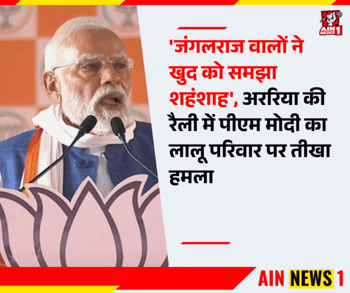AIN NEWS 1 | प्रधानमंत्री नरेंद्र मोदी ने बिहार के अररिया में आयोजित विशाल जनसभा को संबोधित करते हुए विपक्षी महागठबंधन और लालू परिवार पर तीखा हमला बोला। उन्होंने कहा कि जो लोग बिहार में ‘जंगलराज’ लेकर आए थे, वही आज खुद को जनता का ‘माई-बाप’ और ‘शहंशाह’ समझते थे। मोदी ने कहा कि अब बिहार की जनता जाग चुकी है और ऐसे शासन को फिर से कभी बर्दाश्त नहीं करेगी।