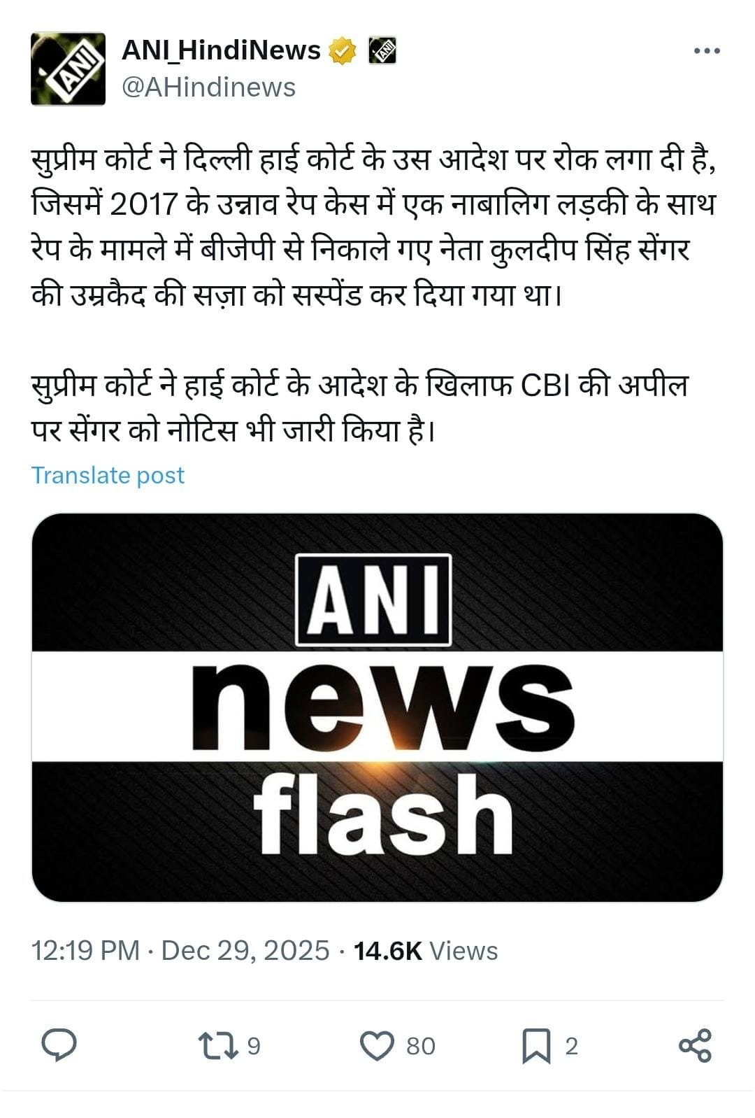 उन्होंने आगे कहा कि हाईकोर्ट के राहत देने वाले आदेश पर पूरी तरह रोक लगा दी गई है और विपक्ष को जवाबी हलफनामा दाखिल करने के लिए समय दिया गया है। तब तक कुलदीप सिंह सेंगर जेल में ही रहेगा।