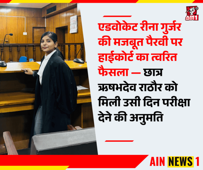 AIN NEWS 1 | राजस्थान हाईकोर्ट, जयपुर बेंच ने एक छात्र के भविष्य को बचाने वाला अहम फैसला सुनाया है। एडवोकेट रीना गुर्जर की तर्कसंगत और सटीक दलीलों के बाद कोर्ट ने मात्र कुछ ही घंटों में आदेश जारी करते हुए छात्र ऋषभदेव सिंह राठौर (बी.ए. एलएल.बी., बैच 2023–27) को उसी दिन परीक्षा में शामिल होने की अनुमति दे दी।