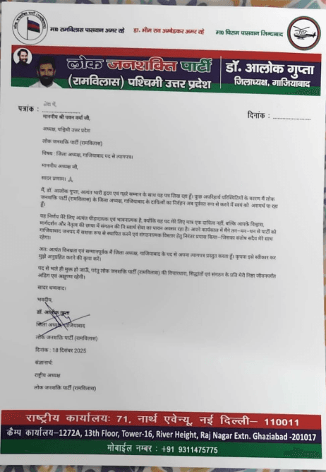 AIN NEWS 1 | गाजियाबाद: राजनीतिक गतिविधियों में बदलाव की एक महत्वपूर्ण खबर सामने आई है। डॉ. आलोक गुप्ता, जो कि पूर्व जिला अध्यक्ष, गाजियाबाद, लोक जनशक्ति पार्टी (रामविलास) के पद पर कार्यरत थे, ने अपने पद से औपचारिक रूप से इस्तीफा दे दिया है। उन्होंने यह कदम 21 दिसंबर 2025 को पार्टी के माननीय प्रदेश अध्यक्ष श्री पवन वर्मा को सौंपकर लिया।
