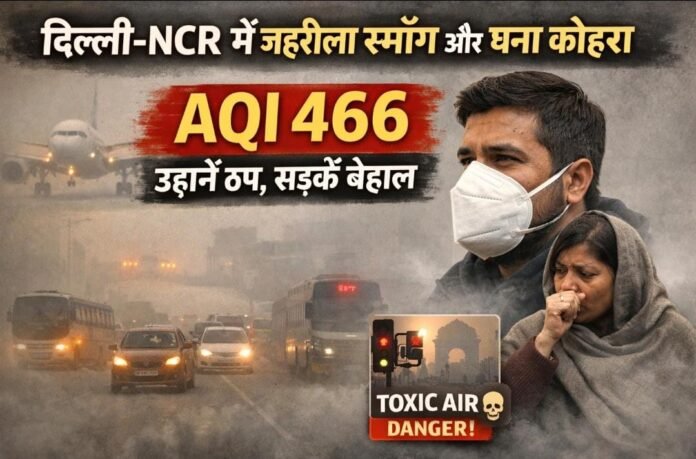 दिल्ली-NCR पर जहरीले स्मॉग और घने कोहरे का कहर, AQI 466 पहुंचा, उड़ानों से लेकर सड़कों तक हालात बिगड़े!