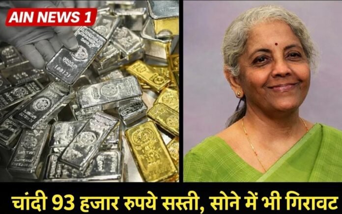 AIN NEWS 1: देश के सर्राफा बाजार में शुक्रवार को अचानक बड़ी हलचल देखने को मिली, जब सोने और चांदी की कीमतों में जबरदस्त गिरावट दर्ज की गई। खास तौर पर चांदी के दामों में आई गिरावट ने निवेशकों और कारोबारियों दोनों को चौंका दिया। बीते 24 घंटों के भीतर चांदी की कीमत में करीब 93,000 रुपये तक की भारी गिरावट दर्ज की गई, जबकि सोने के भाव भी हजारों रुपये नीचे आ गए।
