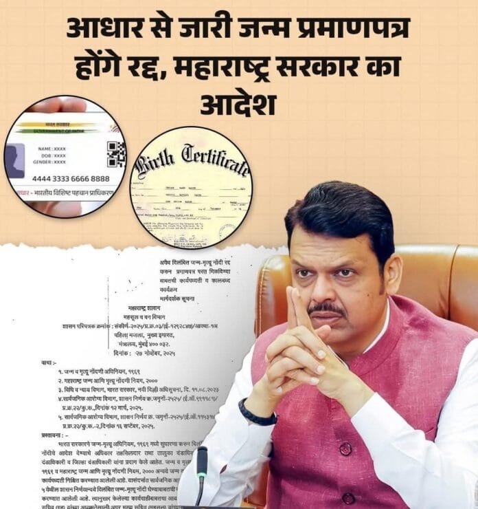 AIN NEWS 1: महाराष्ट्र सरकार ने जन्म प्रमाणपत्र जारी करने की प्रक्रिया में एक बड़ा और महत्वपूर्ण बदलाव किया है। राज्य में लंबे समय से फर्जी जन्म और मृत्यु प्रमाणपत्रों के मामले सामने आ रहे थे, जिसके कारण सरकार ने इस दिशा में सख्त कदम उठाने का फैसला किया है। इसी सिलसिले में अब यह स्पष्ट कर दिया गया है कि आधार कार्ड को जन्म प्रमाणपत्र बनाने के लिए अनिवार्य दस्तावेज के रूप में स्वीकार नहीं किया जाएगा। इसके साथ ही सिर्फ आधार कार्ड के आधार पर जारी किए गए सभी पुराने जन्म प्रमाणपत्रों को भी रद्द करने का निर्देश दिया गया है।