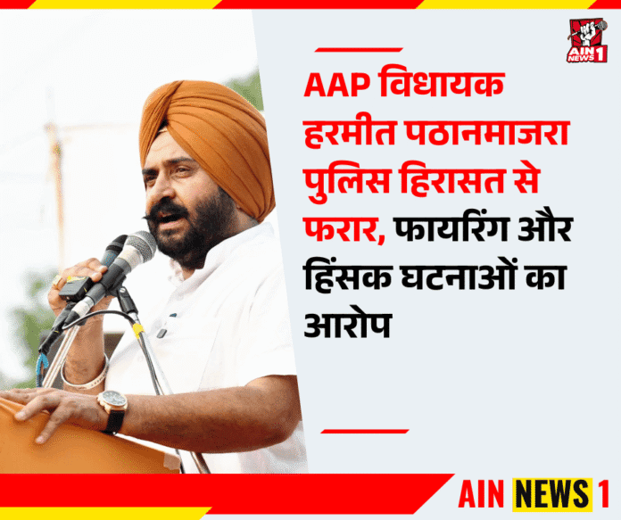 AIN NEWS 1 | पंजाब के आम आदमी पार्टी (AAP) के विधायक हरमीत सिंह पठानमाजरा पुलिस हिरासत से फरार हो गए हैं। यह घटना मंगलवार (02 सितंबर, 2025) को हुई, जब उन्हें लोकल थाने ले जाया जा रहा था। इस दौरान पठानमाजरा और उनके साथियों ने allegedly पुलिस पर फायरिंग की। घटना में एक पुलिसकर्मी घायल हुआ। साथ ही आरोप है कि विधायक ने पुलिसकर्मी पर अपनी गाड़ी चढ़ाई और फरार हो गए।