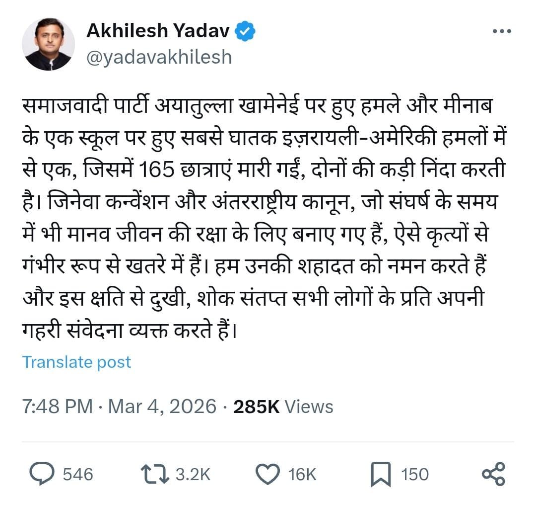 Samajwadi Party leader Akhilesh Yadav strongly condemned the reported attack that led to the death of Iran’s Supreme Leader Ayatollah Ali Khamenei and the devastating strike on a girls’ school in Minab, Iran, where 165 students were killed. Calling the incident cruel and inhuman, Akhilesh Yadav emphasized that even during war, international laws such as the Geneva Convention must protect civilians, especially children and women. His statement on the Iran conflict, the Minab school attack, and the rising tensions involving Iran, Israel, and the United States has drawn significant attention in India’s political discourse.