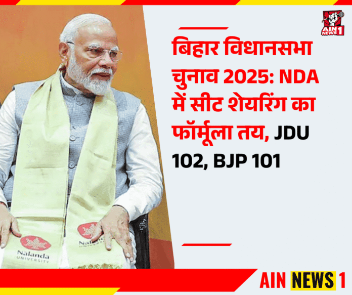 बिहार विधानसभा चुनाव 2025 को लेकर NDA में सीट शेयरिंग का फॉर्मूला साफ हो गया है। मुख्यमंत्री नीतीश कुमार के दिल्ली दौरे के बाद इस पर सहमति बनी है। सूत्रों के अनुसार जदयू को 102 सीटें और BJP को 101 सीटें मिलेंगी।