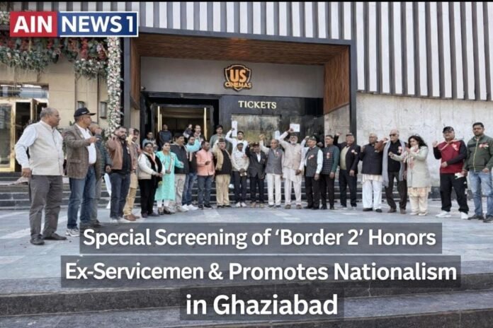 AIN NEWS 1 गाजियाबाद: शहर में 5 फरवरी 2026 को देशभक्ति और सैनिक सम्मान का एक अनोखा दृश्य देखने को मिला। सिहानी चुंगी स्थित यूएस सिनेमा, मूवी वर्ल्ड में फिल्म ‘बार्डर-2’ का विशेष शो आयोजित किया गया। दोपहर 2 बजे शुरू हुए इस कार्यक्रम में शहर के गणमान्य नागरिकों, पूर्व सैनिकों, पत्रकारों, समाजसेवियों और राष्ट्रवादी विचारधारा से जुड़े लोगों की बड़ी संख्या मौजूद रही।