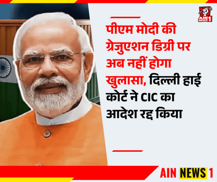 AIN NEWS 1 | प्रधानमंत्री नरेंद्र मोदी की ग्रेजुएशन डिग्री से जुड़ी जानकारी का खुलासा अब नहीं होगा। दिल्ली हाई कोर्ट ने केंद्रीय सूचना आयोग (CIC) के उस आदेश को रद्द कर दिया है, जिसमें दिल्ली यूनिवर्सिटी को पीएम मोदी की डिग्री से संबंधित रिकॉर्ड उपलब्ध कराने का निर्देश दिया गया था।