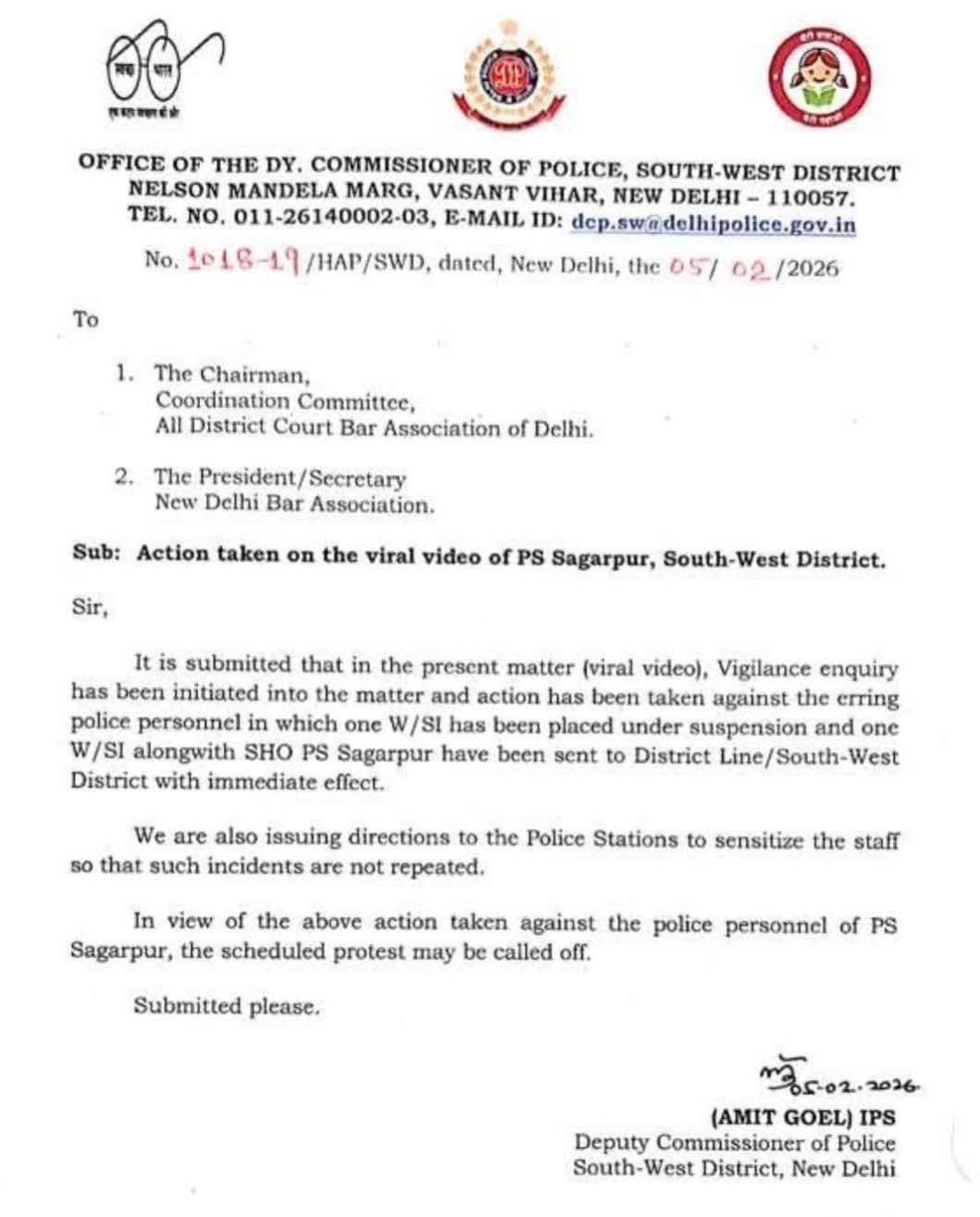 The Deputy Commissioner of Police (DCP) South-West District, New Delhi has initiated a vigilance inquiry into the viral video related to PS Sagarpur. As part of immediate action, one woman constable has been suspended while the SHO and a woman Sub-Inspector have been sent to the District Line. Delhi Police has also issued directions to sensitize staff across police stations to prevent such incidents in the future. The official communication has been sent to the Bar Associations requesting them to call off the proposed protest, highlighting the swift action taken by Delhi Police authorities.