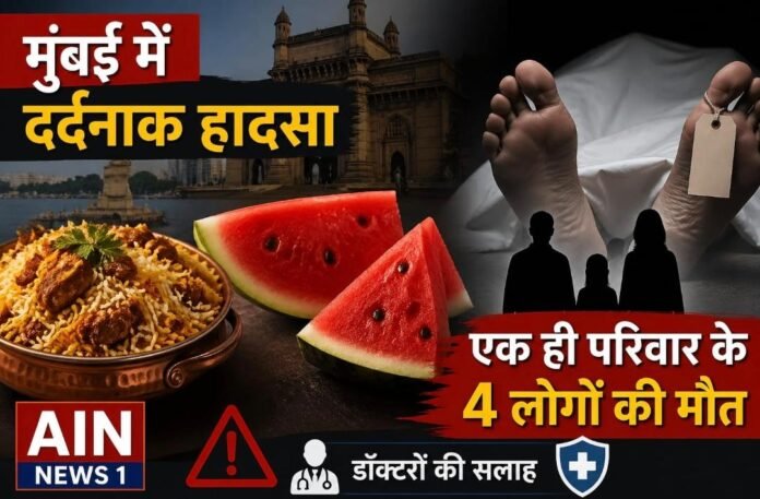 AIN NEWS 1: मुंबई के दक्षिणी इलाके से एक बेहद दुखद और चौंकाने वाली घटना सामने आई है, जिसने लोगों को खाने-पीने की आदतों पर दोबारा सोचने के लिए मजबूर कर दिया है। जानकारी के मुताबिक, एक ही परिवार के चार सदस्यों की संदिग्ध परिस्थितियों में मौत हो गई। शुरुआती रिपोर्ट्स में यह बात सामने आई कि परिवार ने पहले चिकन बिरयानी खाई थी और उसके बाद तरबूज का सेवन किया था। हालांकि, मौत का असली कारण अभी पोस्टमार्टम रिपोर्ट के बाद ही स्पष्ट हो पाएगा।
