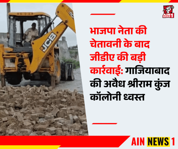 AIN NEWS 1 | मोदीनगर क्षेत्र में अवैध रूप से विकसित की जा रही श्रीराम कुंज कॉलोनी पर आखिरकार गाजियाबाद विकास प्राधिकरण (GDA) ने बुलडोजर चला ही दिया। कई महीनों से इस कॉलोनी को लेकर लगातार शिकायतें आ रही थीं, लेकिन किसी न किसी कारणवश कार्रवाई टलती रही। पर जब भाजपा नेता लोकेश ढोडी ने आत्मदाह की चेतावनी दी, तो प्रशासन हरकत में आया और सोमवार को पूरी कॉलोनी को ध्वस्त कर दिया गया।