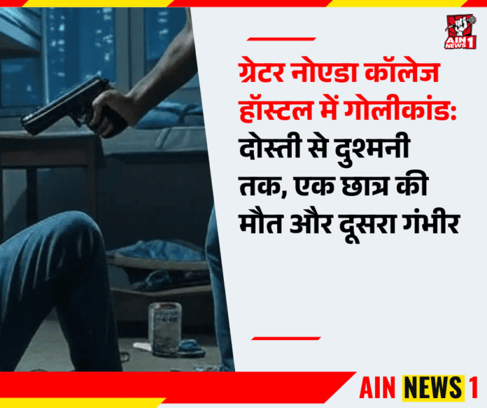 AIN NEWS 1 | ग्रेटर नोएडा में स्थित एक निजी कॉलेज के हॉस्टल में सोमवार की रात एक सनसनीखेज वारदात ने सभी को दहला दिया। दो छात्रों के बीच आपसी कहासुनी इतनी बढ़ गई कि मामला गोलीबारी तक पहुंच गया। दोनों कभी गहरे दोस्त थे, लेकिन मामूली विवाद ने उनकी दोस्ती को खून-खराबे में बदल दिया। इस गोलीकांड में एक छात्र की मौके पर ही मौत हो गई, जबकि दूसरा छात्र गंभीर हालत में अस्पताल में भर्ती है।