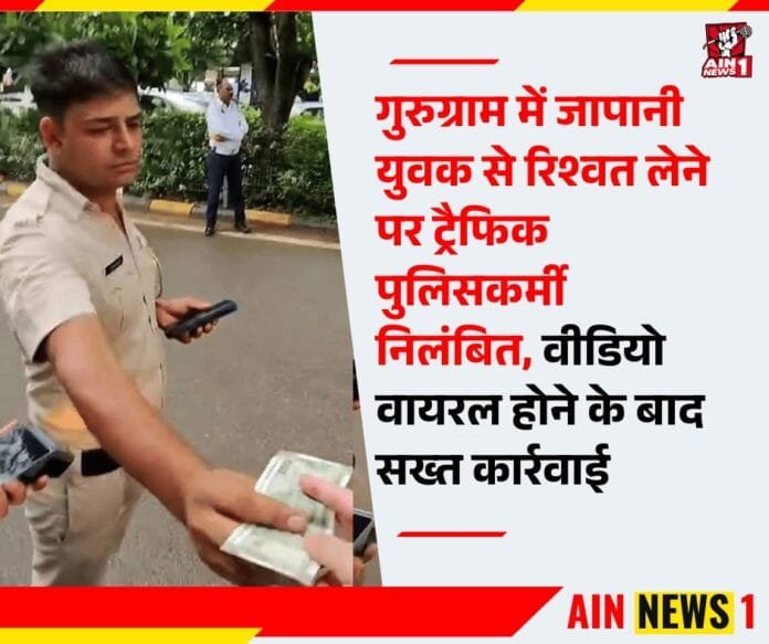 AIN NEWS 1: गुरुग्राम की सड़कों पर रोज़ाना ट्रैफिक का भारी दबाव देखा जाता है। इसी बीच एक ऐसा वीडियो वायरल हुआ जिसने पूरे पुलिस विभाग को हिलाकर रख दिया। वीडियो में साफ देखा गया कि ट्रैफिक पुलिसकर्मी एक जापानी नागरिक से ₹1000 की रिश्वत लेते नजर आ रहे हैं। इस मामले ने सिर्फ गुरुग्राम ही नहीं, बल्कि पूरे देश में बहस छेड़ दी है।