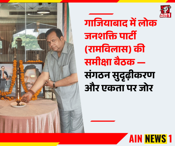 AIN NEWS 1 | लोक जनशक्ति पार्टी (रामविलास) की जिला इकाई गाजियाबाद द्वारा रविवार को एक महत्वपूर्ण समीक्षा बैठक का आयोजन किया गया। इस बैठक का मुख्य उद्देश्य संगठन की वर्तमान गतिविधियों का मूल्यांकन करना और आगामी महीनों के लिए ठोस कार्ययोजना तैयार करना था। बैठक की शुरुआत बाबा साहेब डॉ. भीमराव अंबेडकर और स्वर्गीय श्री रामविलास पासवान जी को श्रद्धांजलि अर्पित कर की गई।