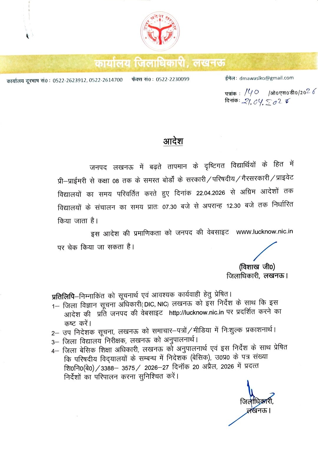 जिलाधिकारी लखनऊ द्वारा जारी आदेश के अनुसार, जनपद के सभी बोर्डों के प्री-प्राइमरी से लेकर कक्षा 8 तक के सरकारी, परिषदीय, सहायता प्राप्त और निजी स्कूलों का समय बदल दिया गया है। अब ये स्कूल 22 अप्रैल 2026 से अगले आदेश तक सुबह 7:30 बजे से दोपहर 12:30 बजे तक संचालित किए जाएंगे।