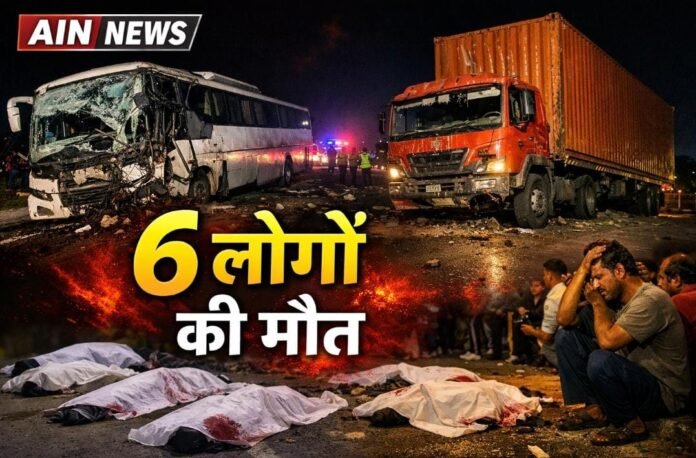 A tragic Mathura accident on the Yamuna Expressway claimed six lives after a speeding container truck rammed into a stationary sleeper bus near Milestone 88 in the Surir police station area. The bus was traveling from Nagloi in Delhi to Rasulabad in Kanpur when passengers stepped out after the driver halted the vehicle on the highway instead of a designated green zone. The container truck accident highlights serious concerns about road safety, expressway parking rules, and high-speed traffic risks in Uttar Pradesh.