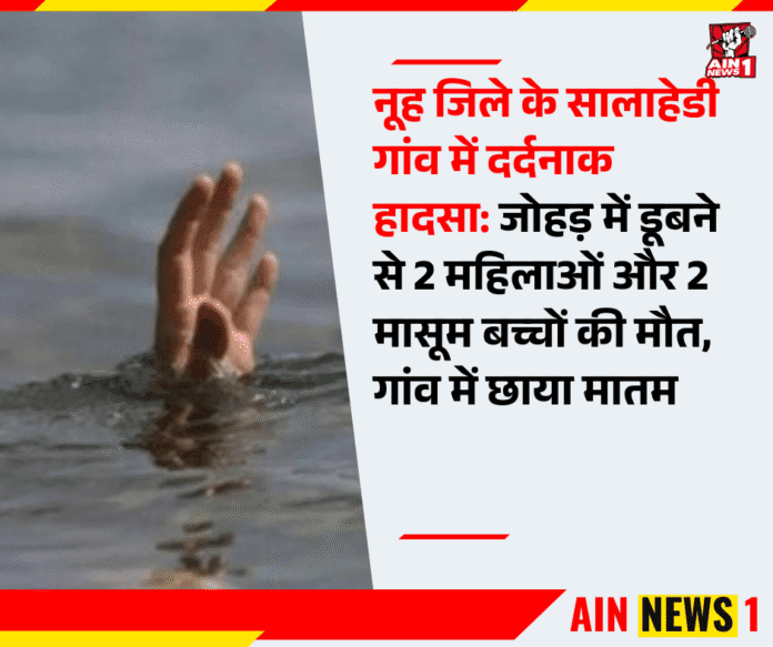 AIN NEWS 1 | हरियाणा के नूह जिले के सालाहेडी गांव में शनिवार की दोपहर एक दिल दहला देने वाला हादसा हुआ, जिसने पूरे गांव को गहरे सदमे में डाल दिया। यह घटना दोपहर लगभग 2 बजे के बाद उस समय घटी जब गांव के पास बने एक जोहड़ (तालाब) में अचानक चार लोग डूब गए। इस हादसे में दो महिलाओं और दो मासूम बच्चों की दर्दनाक मौत हो गई।