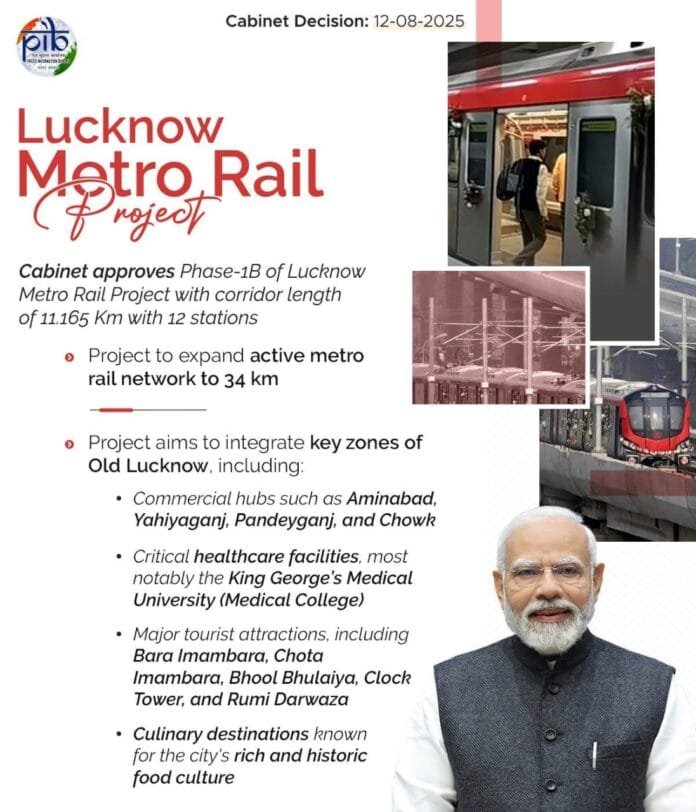 AIN NEWS 1 लखनऊ, 12 अगस्त 2025 – प्रधानमंत्री नरेंद्र मोदी की अध्यक्षता में हुई केंद्रीय कैबिनेट बैठक में लखनऊ मेट्रो रेल परियोजना के फेज-1B को मंजूरी दे दी गई है। इस नए चरण में पुराना लखनऊ पहली बार मेट्रो कनेक्टिविटी से जुड़ जाएगा, जिससे शहर की ऐतिहासिक और व्यावसायिक धड़कन को नई रफ्तार मिलने की उम्मीद है।