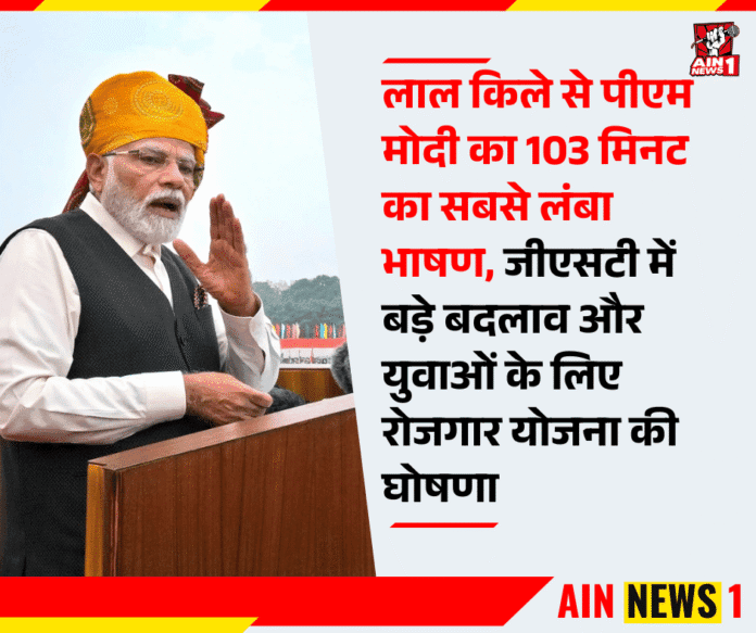 AIN NEWS 1 नई दिल्ली, 15 अगस्त – स्वतंत्रता दिवस के अवसर पर प्रधानमंत्री नरेंद्र मोदी ने लाल किले की प्राचीर से देश को संबोधित करते हुए कई अहम घोषणाएं कीं. इस बार उनका भाषण 103 मिनट का रहा, जो अब तक का सबसे लंबा स्वतंत्रता दिवस संबोधन है. प्रधानमंत्री ने देशवासियों को जीएसटी में बड़े बदलाव का भरोसा दिया, युवाओं के लिए रोजगार योजना की शुरुआत की और पाकिस्तान को सख्त संदेश भी दिया.