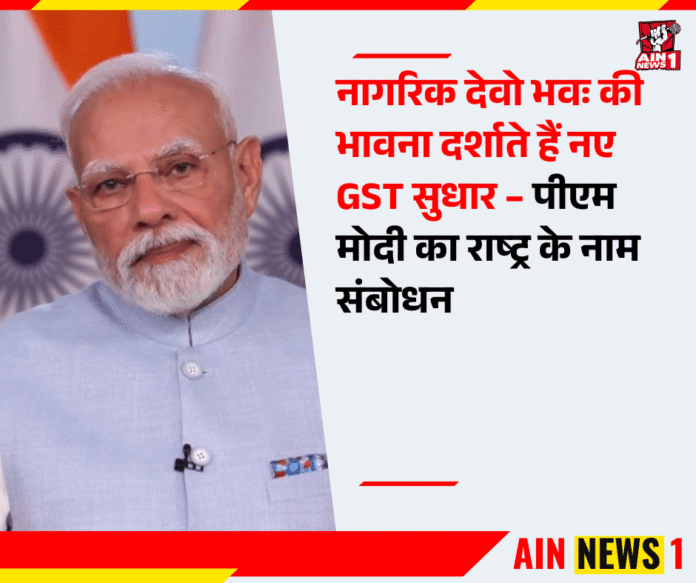 AIN NEWS 1 | प्रधानमंत्री नरेंद्र मोदी ने रविवार (21 सितंबर, 2025) को शाम 5 बजे देशवासियों को संबोधित किया। यह संबोधन खासतौर पर आने वाले नए जीएसटी सुधारों को लेकर था, जो सोमवार (22 सितंबर, 2025) से पूरे देश में लागू होंगे। पीएम मोदी ने इसे देश के लिए “जीएसटी बचत उत्सव” करार दिया और कहा कि इस सुधार से करोड़ों परिवारों, व्यापारियों और निवेशकों को सीधा लाभ मिलेगा।