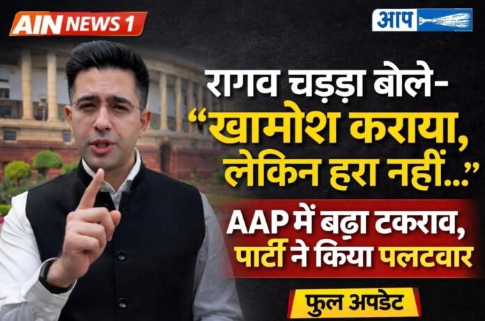 AIN NEWS 1: आम आदमी पार्टी (AAP) के राज्यसभा सांसद Raghav Chadha को पार्टी द्वारा उपनेता पद से हटाए जाने के बाद अब सियासी घमासान खुलकर सामने आ गया है। शुक्रवार को राघव चड्ढा ने इस पूरे मामले पर पहली बार प्रतिक्रिया देते हुए एक वीडियो संदेश जारी किया, जिसमें उन्होंने कहा कि उन्हें “खामोश करवाया गया है, लेकिन वे हारे नहीं हैं।”