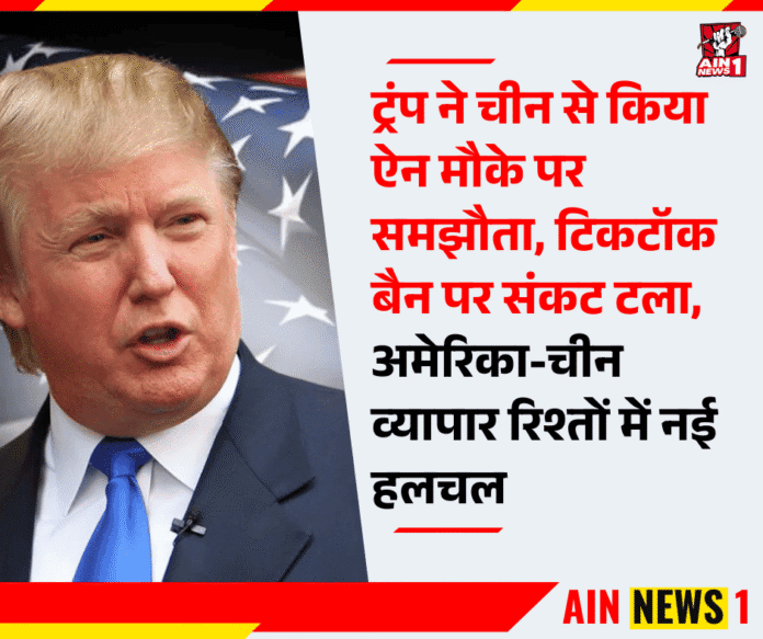AIN NEWS 1 | अमेरिकी राष्ट्रपति डोनाल्ड ट्रंप ने एक बड़ा ऐलान किया है, जिसने न सिर्फ अमेरिकी युवाओं को राहत दी बल्कि दुनिया की दो सबसे बड़ी अर्थव्यवस्थाओं के बीच तनाव को भी कम कर दिया। ट्रंप ने सोमवार (15 सितंबर, 2025) को सोशल मीडिया प्लेटफॉर्म एक्स (X) पर लिखा कि अमेरिका और चीन के बीच एक अहम समझौता हुआ है, जिससे चीनी ऐप टिकटॉक अमेरिकी बाजार में काम करना जारी रख सकेगा। यह समझौता उस डेडलाइन से ठीक पहले हुआ है, जब अमेरिकी सरकार ने चीनी कंपनी बाइटडांस को अपनी अमेरिकी हिस्सेदारी बेचने का आदेश दिया था।