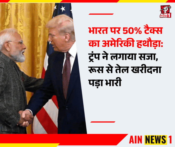 AIN NEWS 1 | भारत को रूस से सस्ता तेल खरीदना अब महंगा पड़ गया है। अमेरिकी राष्ट्रपति डोनाल्ड ट्रंप ने भारत के खिलाफ सख्त कदम उठाते हुए कुल 50% टैरिफ लगाने का ऐलान कर दिया है। उन्होंने कहा कि भारत लगातार रूस से तेल खरीद कर अप्रत्यक्ष रूप से रूस की युद्ध मशीनरी को समर्थन दे रहा है, और यही कारण है कि अमेरिका को यह कठोर निर्णय लेना पड़ा।