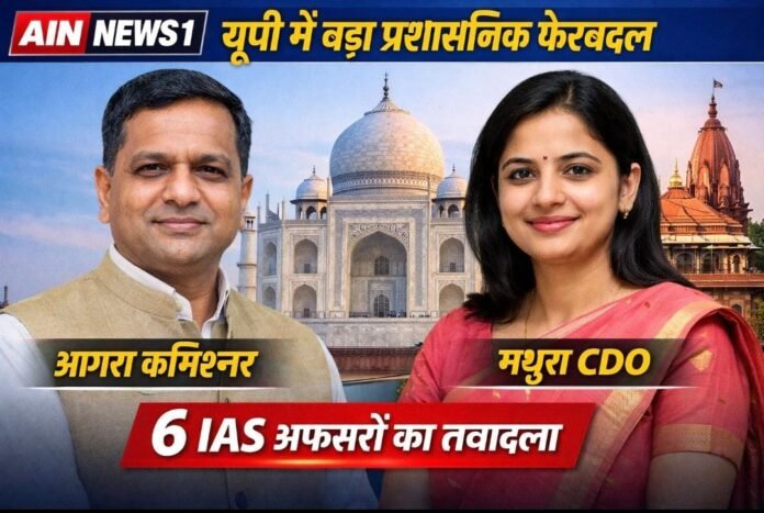 AIN NEWS 1: उत्तर प्रदेश सरकार ने प्रशासनिक व्यवस्था को और मजबूत करने के उद्देश्य से एक बड़ा कदम उठाया है। शनिवार देर शाम जारी आदेश में राज्य सरकार ने छह आईएएस अधिकारियों के तबादले कर दिए हैं। इस प्रशासनिक फेरबदल में आगरा, मथुरा, मऊ और फिरोजाबाद जैसे अहम जिलों में नई नियुक्तियां की गई हैं। सरकार का मानना है कि इन बदलावों से विकास योजनाओं को नई गति मिलेगी और शासन-प्रशासन की कार्यशैली अधिक प्रभावी बनेगी।