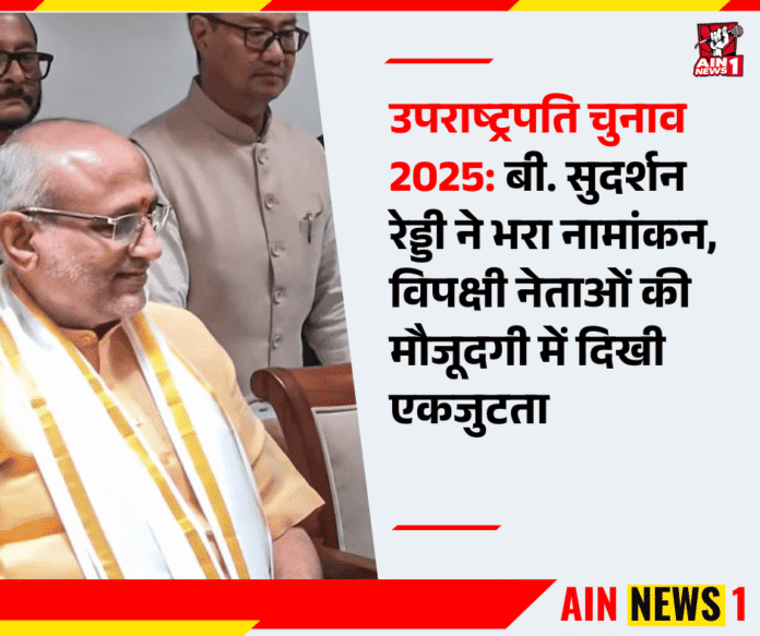 AIN NEWS 1 | भारत के उपराष्ट्रपति चुनाव 2025 को लेकर राजनीतिक सरगर्मी तेज हो गई है। गुरुवार, 21 अगस्त 2025 को इंडिया गठबंधन (INDIA Bloc) के उम्मीदवार बी. सुदर्शन रेड्डी ने नामांकन दाखिल कर दिया। इस मौके पर कांग्रेस नेता सोनिया गांधी, सांसद राहुल गांधी, राज्यसभा में विपक्ष के नेता मल्लिकार्जुन खरगे, समाजवादी पार्टी के वरिष्ठ नेता रामगोपाल यादव और शिवसेना (उद्धव गुट) के संजय राउत सहित कई विपक्षी दलों के दिग्गज नेता मौजूद रहे।